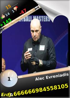 | 22 | Alex Matic | Cue Tang Clan | 1,630 | 15 | 10 | 5 | 66.7 | 120 | 92 | 1.9 | |